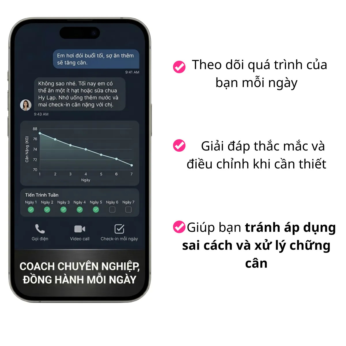 Ngoài ra, trong suốt chương trình, bạn sẽ có coach theo sát để hỗ trợ khi cần thiết, giúp bạn điều chỉnh kế hoạch sao cho phù hợp với lịch trình của mình.